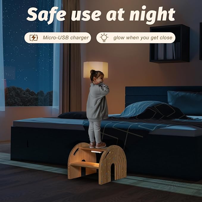 Rainbow Wooden Toddler Step Stool, Two-Step Stool for Bathroom, Kitchen and Potty Training,with Safety Non-Slip Pad, Handle and Auto Light(Natural)