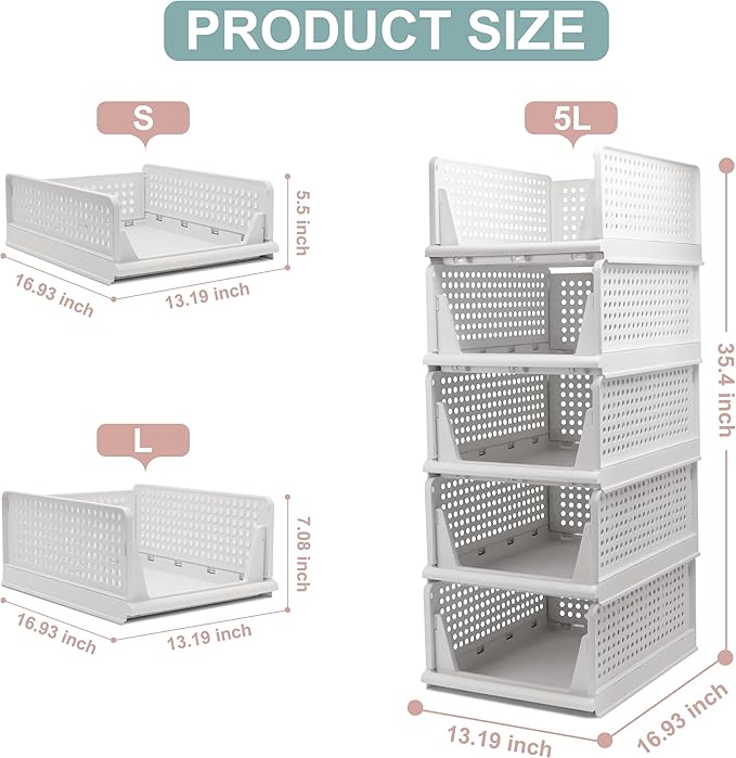 - 【Customizable & Space-Saving】Adjust to your own liking by stacking the perfect number of stackable plastic storage drawer bins to fit your space. This set of 5 wardrobe storage organizers can be stacked to maximize vertical space, keeping your home organized. Dimensions of each wardrobe clothes organizer when set up: S: 16.6" x 13.1" x 5.55" (L x W x H), L: 16.6" x 13.1" x 7.32" (L x W x H)