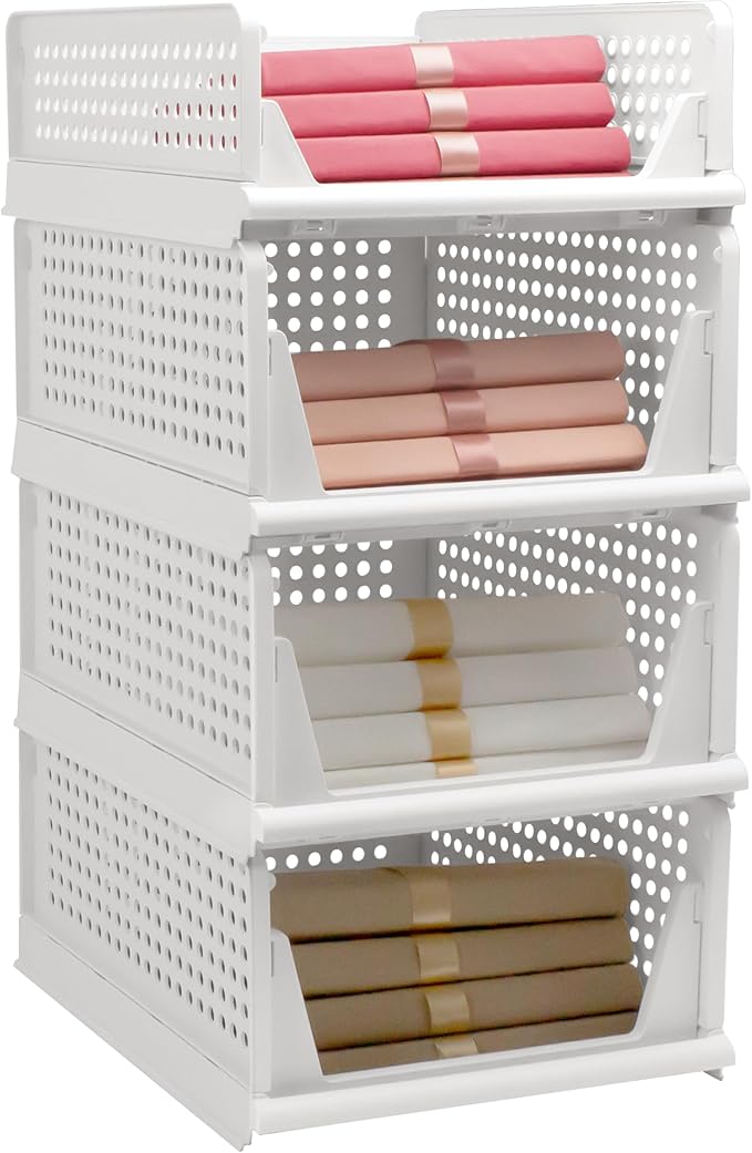Stackable Foldable Storage Baskets, Folding Storage Bins, Closet Organizers and Plastic Drawer Shelf Storage Container for Wardrobe, Cupboard, Kitchen, Bathroom, Office (White, 3L1S)