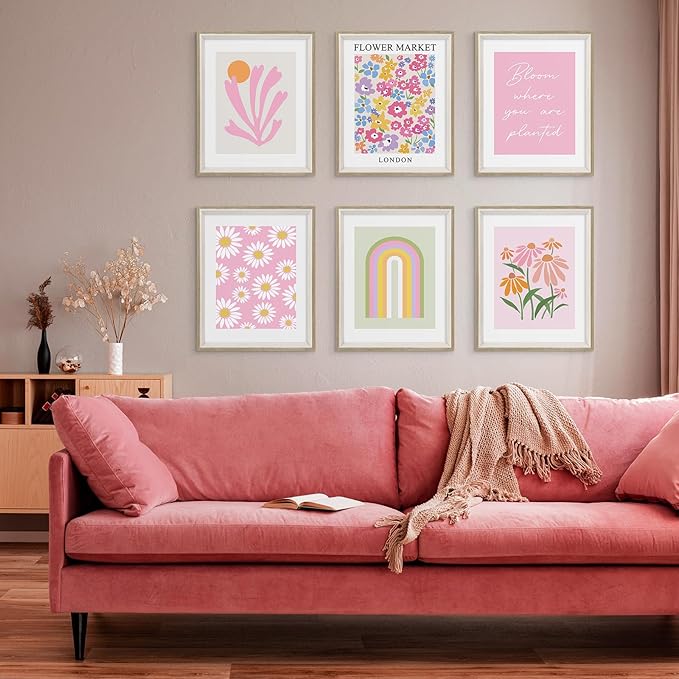 Habseligkeit Pink Danish Pastel Wall Art Prints, Boho Matisse Wall Art Exhibition Posters, Flower Market Posters for Room Decor Aesthetic Framed, 8x10in, Set of 6