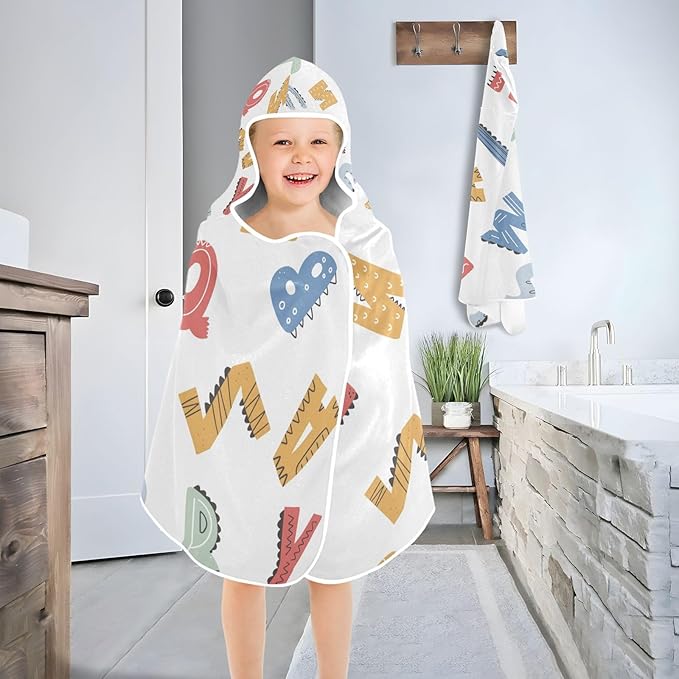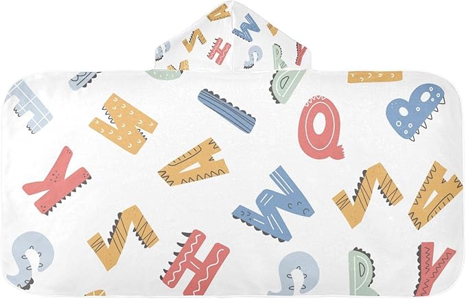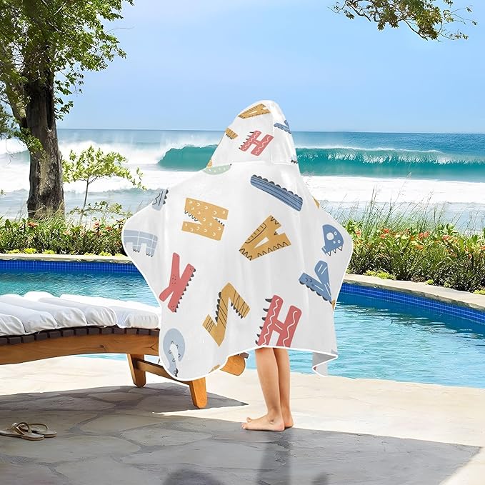 Kids Hooded Beach Towel, Cute Dinosaur Alphabet Print Beach Bath Towel with Hood for Boys Girls 50"x23.5", Soft Absorbent Quick Dry Beach Swim Pool Towel for Toddler