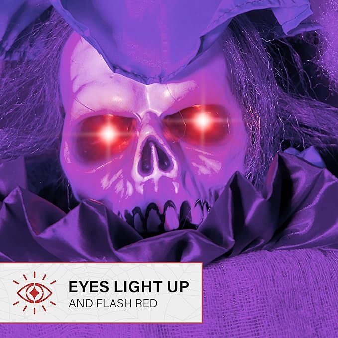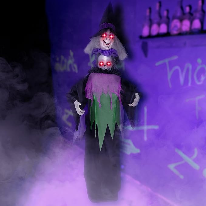 - Lights up and Moves: This witch's head pops up when activated while her eyes glow in red LED lights