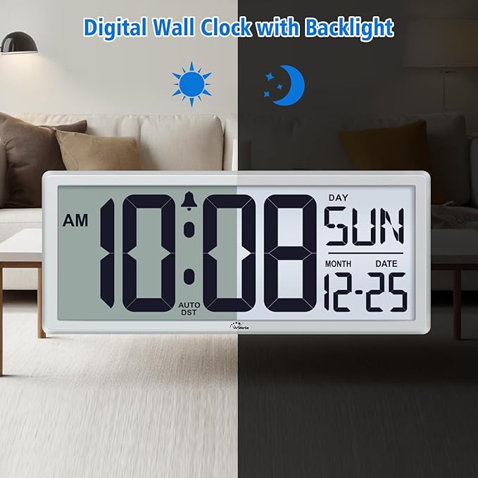 - [𝐋𝐚𝐫𝐠𝐞 𝐃𝐢𝐠𝐢𝐭𝐚𝐥 𝐖𝐚𝐥𝐥 𝐂𝐥𝐨𝐜𝐤 𝐰𝐢𝐭𝐡 𝐁𝐚𝐜𝐤𝐥𝐢𝐠𝐡𝐭] 14*6 inches large display with 4.3 inches numbers make this digital wall clock easy to read and it's visible around the entire room. Three levels (OFF-LOW-HIGH) backlight helps you to know what time it is without turning the light on late at night.