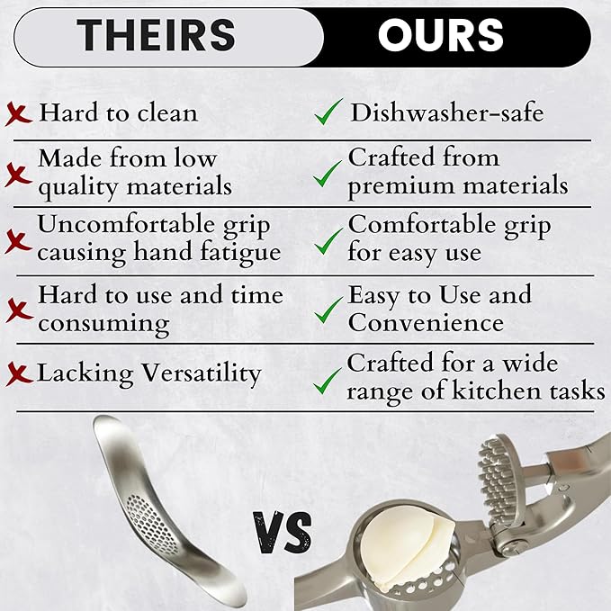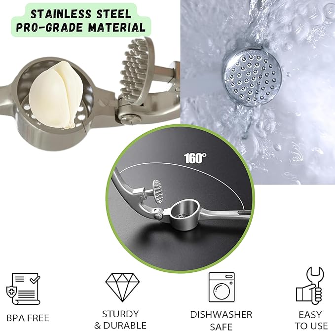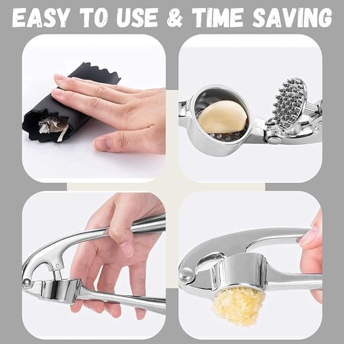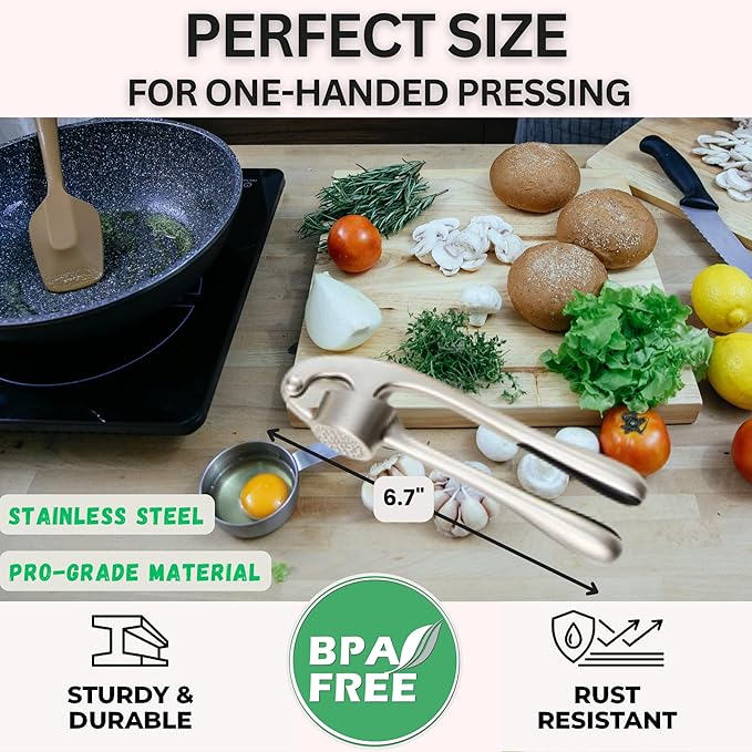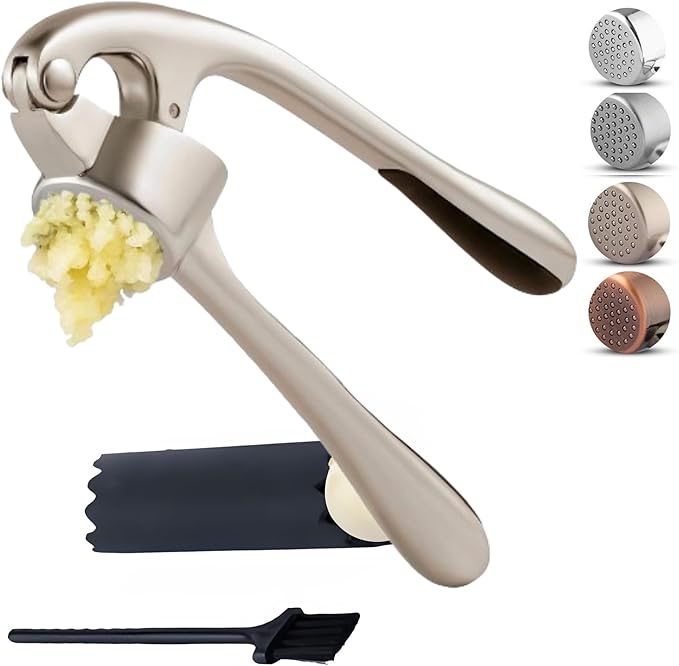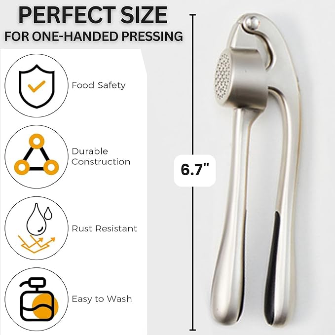 - ??Built to Last: Zinc stainless steel is an ideal material for garlic presses, it is strong enough to easily and perfectly press through garlic. Our premium quality stainless steel garlic press is constructed from food-grade, rust-resistant materials meant to be among your favorite kitchen gadgets for years to come