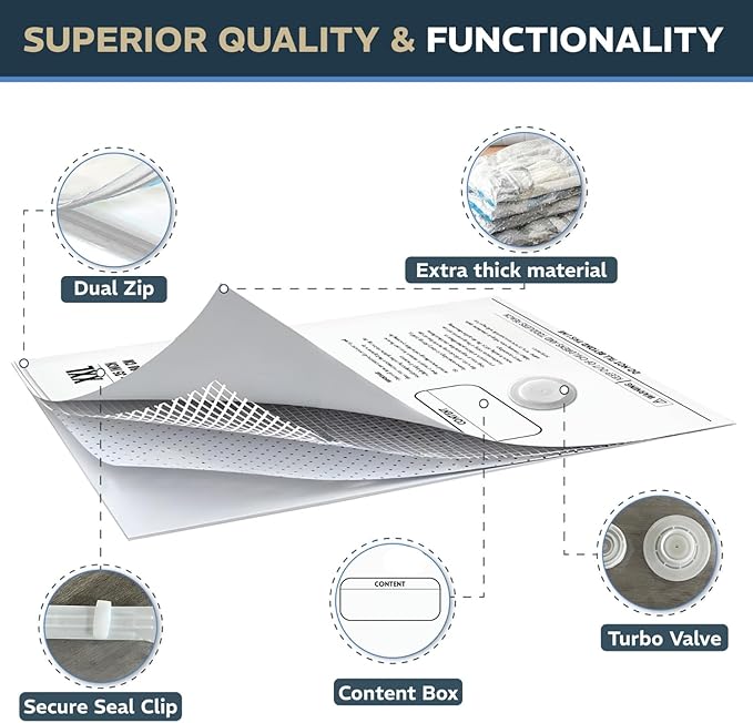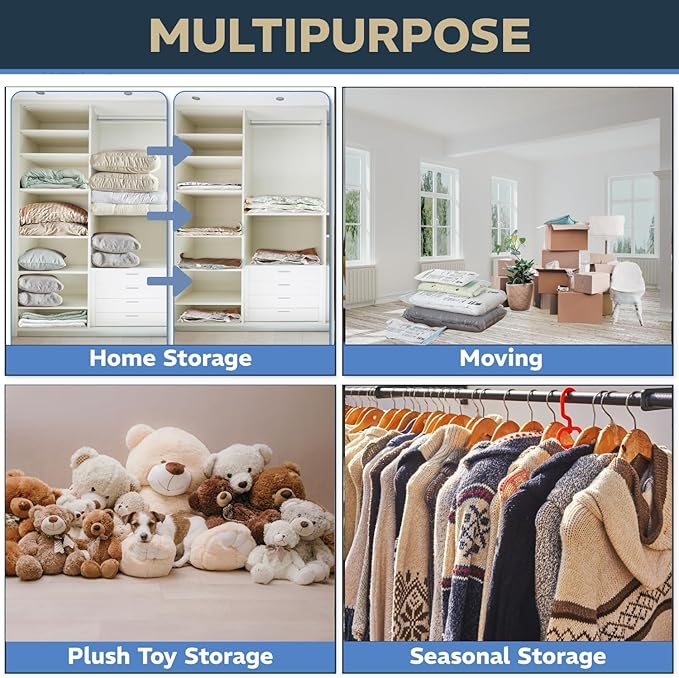 - VERSATILE APPLICATION: Perfect for closet organization, storing seasonal items, packing for travel, and even moving. Our vacuum storage bags are designed to fit seamlessly into any lifestyle, offering reliable protection and space-saving solutions for everything from bulky winter coats to vacation essentials.