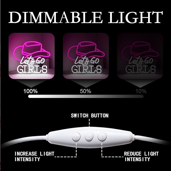- Unique Neon Sign: Let's Go Girls Neon Sign creates a dreamy and relaxing atmosphere for your bedroom/bar/gaming room through its unique shape and bright colors. This is a wall art that soothes and heals people's nervous systems through lighting. When the pink light belonging to the cowgirl hat lights up, your world will be filled with a romantic and wild natural atmosphere.