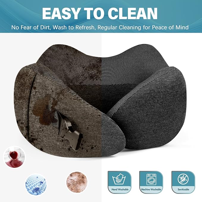 PORTHOLIC 2024 Upgraded Travel Neck Pillow with Buckle,100% Pure Memory Foam Travel Neck Pillow for Airplane Travel Flight Headrest Sleep, Portable Plane Accessories(Dark Grey)