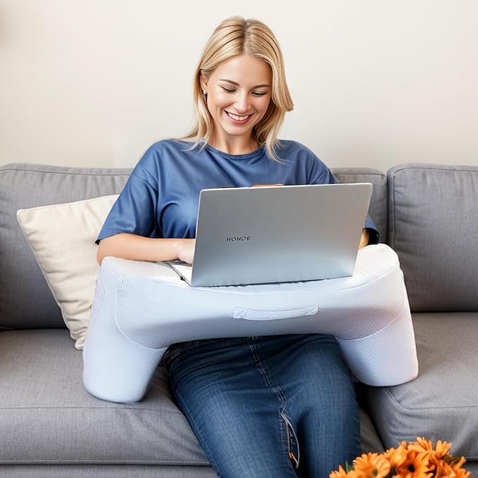 - This lap desk pillow for adults is ideal for reading books or newspapers, whether you're lounging on the sofa or lying in bed. Simply place your legs in the groove, rest your elbows on the memory foam pillow, and enjoy maximum comfort and relaxation.