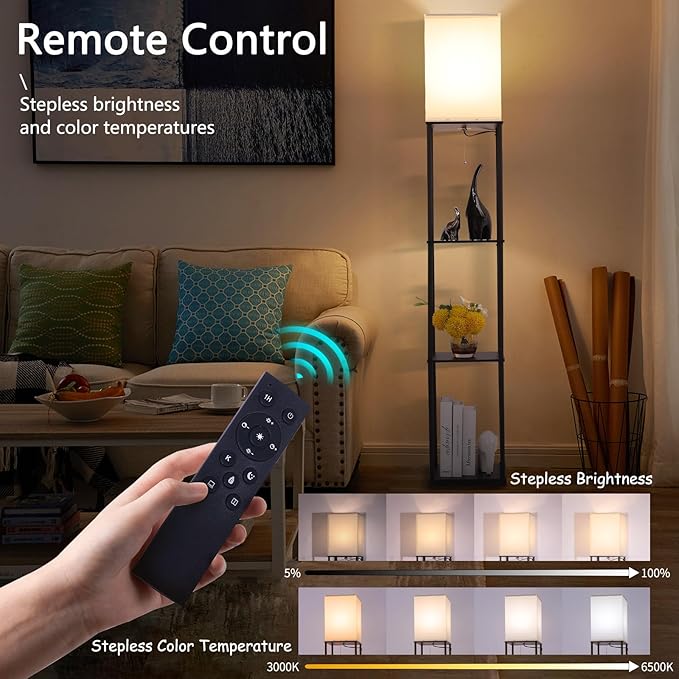 Floor Lamp with Shelves, Modern Square Standing Lamp with 3-Color Remote Control Dimming Bulb, Corner Display Bookshelf Lamp for Living Room, Bedroom and Office (black-9YK)