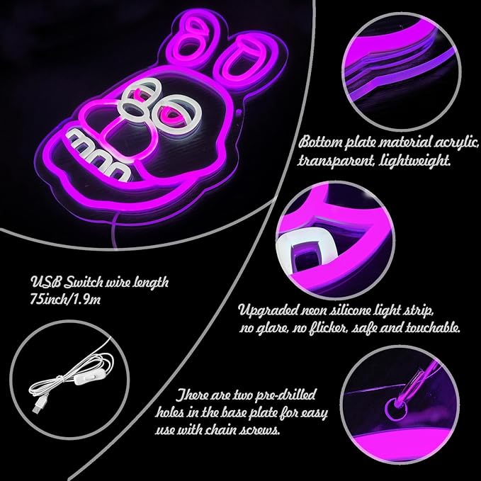 - Unique Design: Withered Bonnie Neon Sign for Wall Decor, featuring an anime rabbit LED light in pink and purple hues.