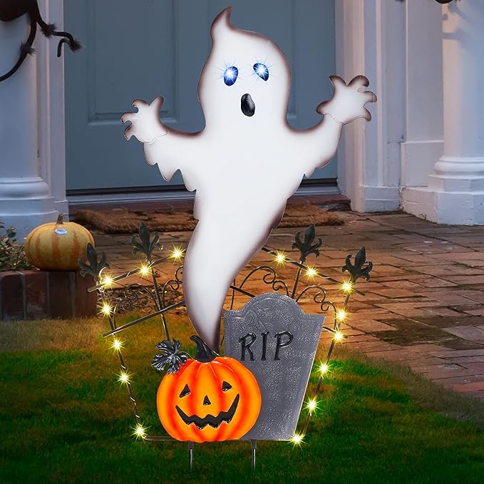- IDEAL HALLOWEEN OUTDOOR DECOR: Joliyoou Halloween metal stake is ideal for placement at your lawn, garden, yard, flowerpot, and any other places where the stakes can be inserted. The solar ghost stake would undoubtedly impress the passersby and earn you plenty of compliments during Halloween season.