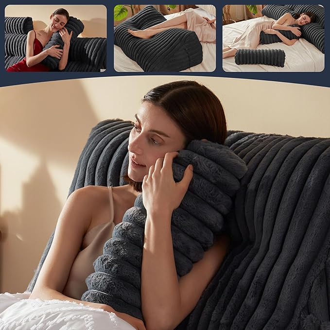 Faux Fur Headboard Pillow with 2 Pack Neck Roll Pillow Large Headboard Pillow Soft and Supportive with Removable Cover (Grey, Queen)