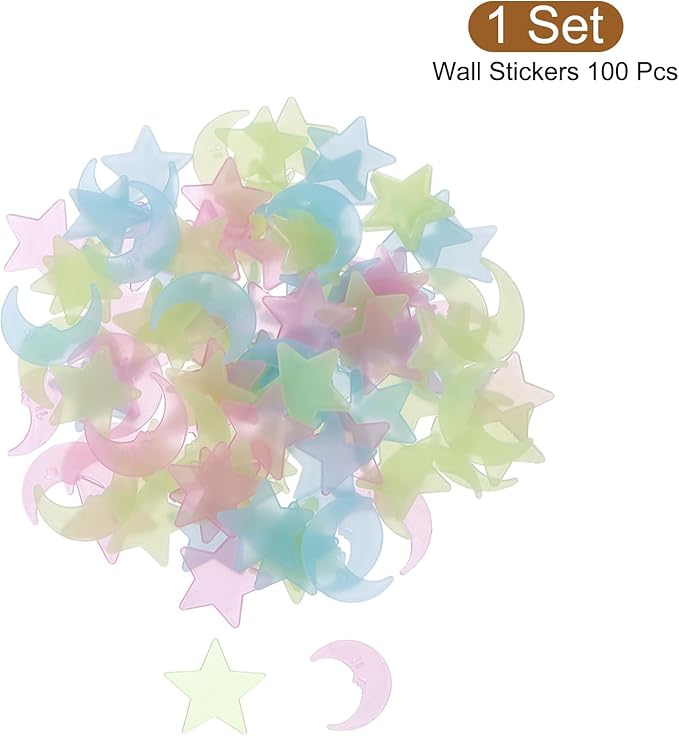 uxcell 100pcs Glow in The Dark Stars and Moon Fluorescent Plastic Wall Stickers Adhesive Murals Decals for Home Art Bedroom Wall Decorations, Multicolor