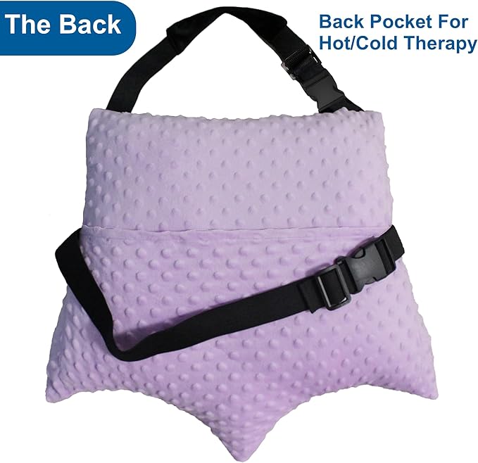- The pillow comfortably fits your body,protecting sensitive areas from the pressure of seat belt and ensuring a smooth ride home from the hospital. The back pocket is suitable for a heat or ice pack. The convenient front pocket is handy for storing a remote, phone or book. The side has a hole to put your hands through to keep warm.