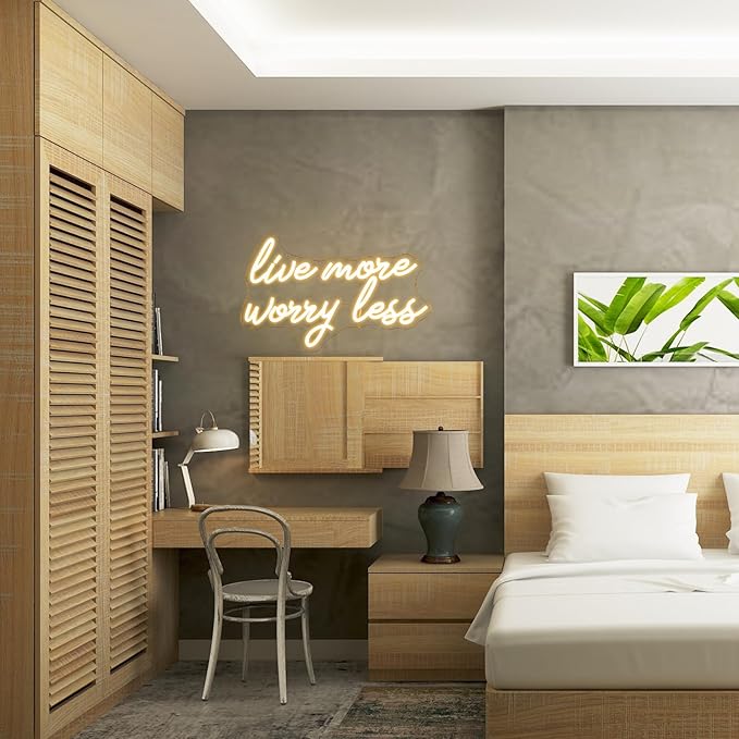 - Brightens Up Your Room: Live More Worry Less neon sign is a splendid injection of positivity into your bedroom decor. Neon signs for wall decor with warm white glow emanates an inspiring message, setting the mood for relaxation and tranquility