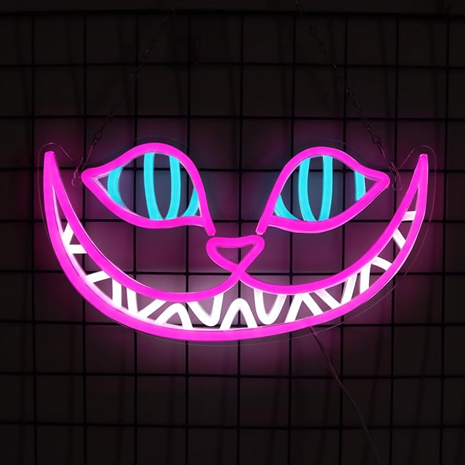 - 【Size & Package】The size of Cheshire Cat neon sign is: 17x9 inch(44*24cm).The package include:1*Smile Cat sign, 1*hanging chain(23inch), 1*dimming power cord(5feet).