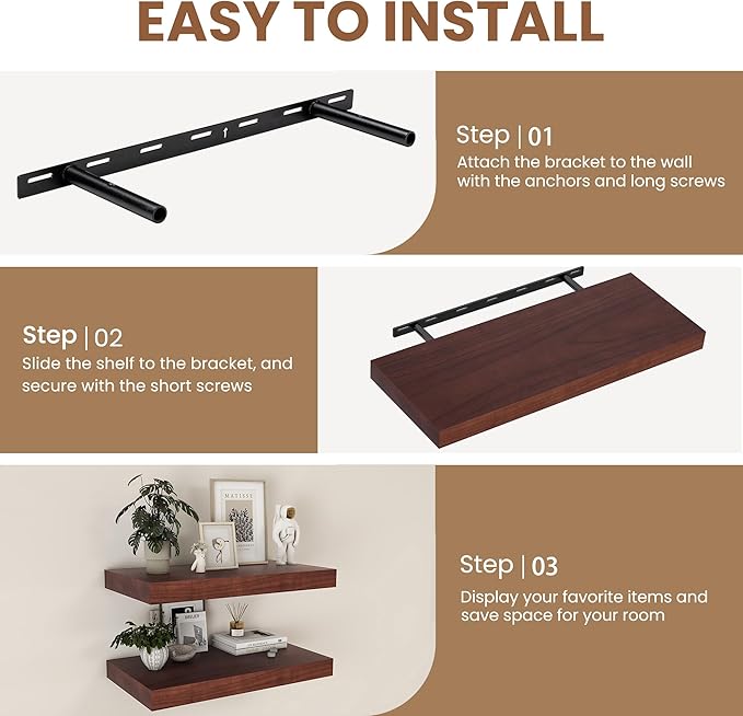 - 【Easy to Assemble】Our upgraded hidden mounting bracket was designed to line up with 16" framing studs on center and sit Flush-To-Wall. Instructions, magnetic level, drywall anchors, and screws included. This is great because you can easily mount these rustic shelves Gap-Free to any surface in less than 10 minutes!