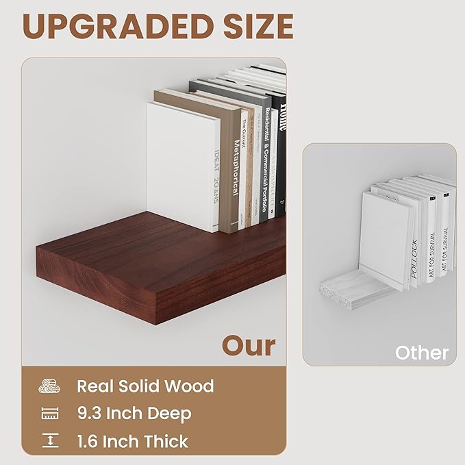 - 【9.3 INCH DEEP FLOATING SHELF】This extra deeper and thicker wall shelves are 9.3 inches in depth and 1.6 inches in thickness instead of the regular narrow floating shelves, you can put photos, pictures, DVD players, videos, books, toys, and some other knickknack on this beautiful display wooden shelf.
