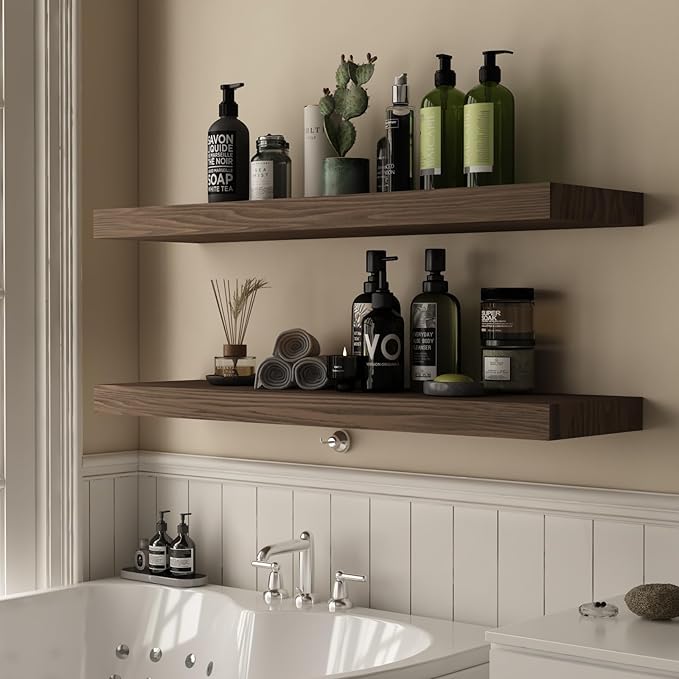 Floating Shelves for Wall - 32 x 9 Inch Natural Wood Shelves for Bathroom, Bedroom, Kitchen Decor, Farmhouse Decor Set of 2, Rustic Brown