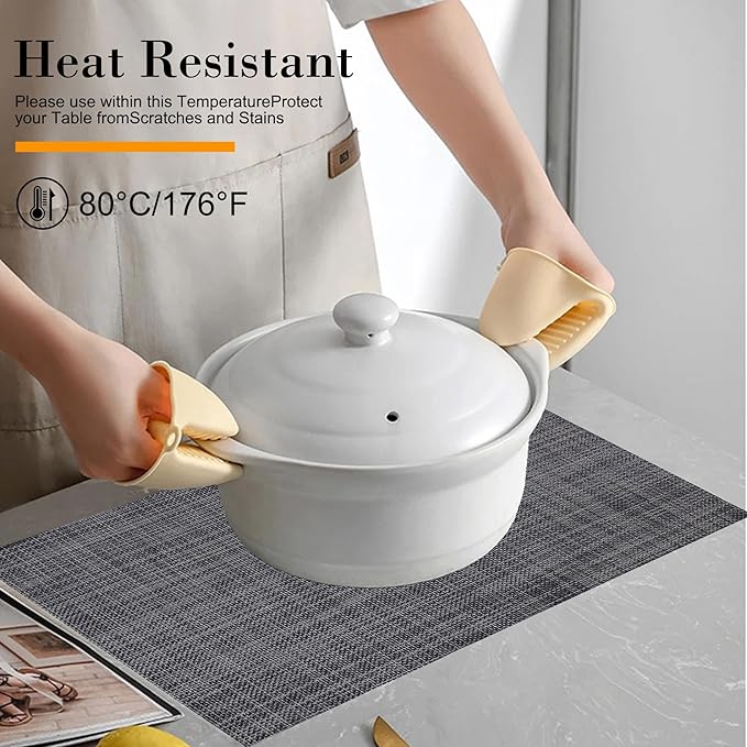 - Protect Your Table:Our placemats protect your table from scratches and spills while adding style. Heat-resistant up to 176°F (80°C), they also keep your food warm. With high-quality woven vinyl construction, they resist stains and water for daily use. Elevate your dining experience with these elegant and durable mats.