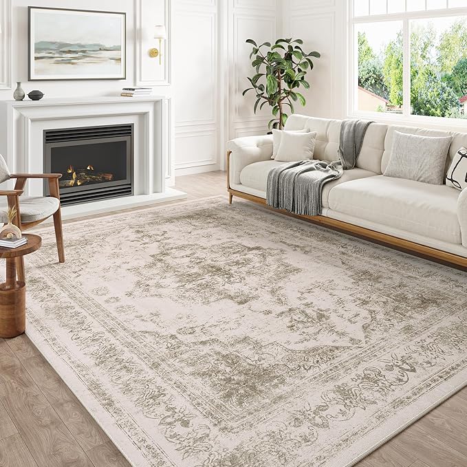 Washable Rug 10x14 Area Rug for Living Room Taupe Vintage Boho Medallion Large Distressed Retro Carpet Non Slip Indoor Low Pile Small Soft Bedroom Dining Room Home Office