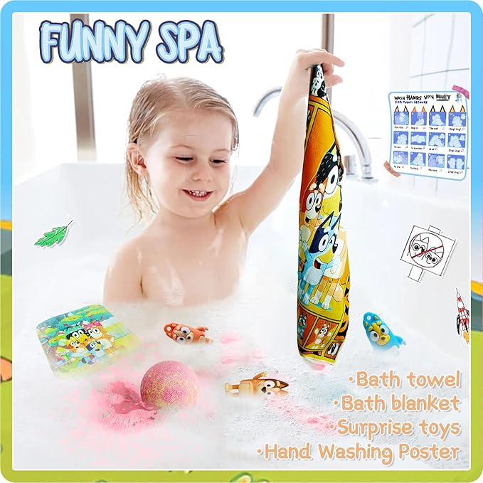 - 【Bath Bombs with Surprise Inside】2 organic bath bombs for kids (5oz), which is buried with a surprise toy randomly selected from 50+ The Heelers toys. Kids will love watching the drops crazy fizz and change the color of the water (no oil ring). Create a Bubble Bath with sea salt and essential oils, which is equivalent to a hot spring bath, helping kids sleep better. The Heeler Family kids bath towels, bath blanket and socks offers swift water absorption and warmth, ensuring that children feel cozy and snug as if wrapped in a warm embrace from their favorite characters.