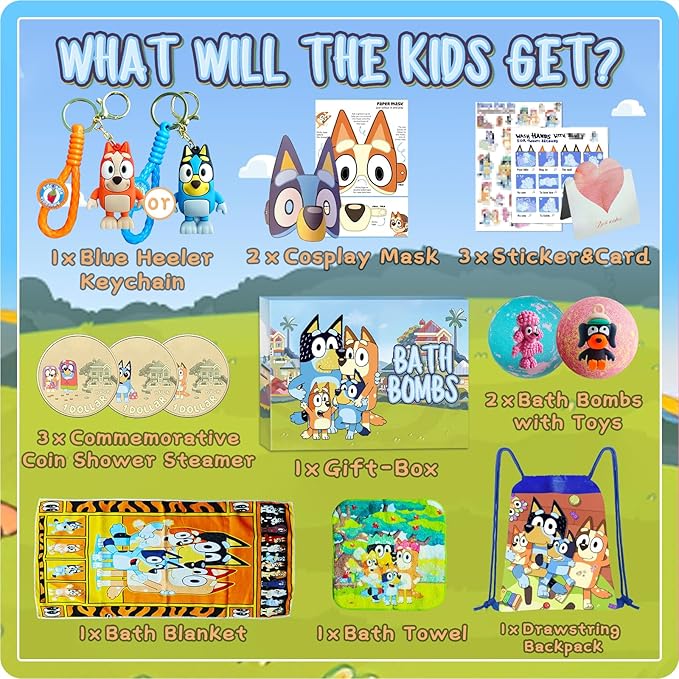 - 【The Blue Heelers Gift Set】This Classic The Heelers-Gift-Box gift set is the most stunning choice for kids. It contains 2 bath bombs with suprise toy inside, 3 Heelers Family Commemorative Coin shower steamers, 2 Heeler puppy paper mask, 1 keychain toy, 1 drawstring backpack, 1 hand washing poster, 1 bath blanket, 1 kids bath towel, 1 sticker, 1 gift card. Every item of the bath gifts set is exactly what kids want.
