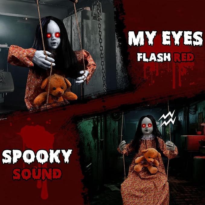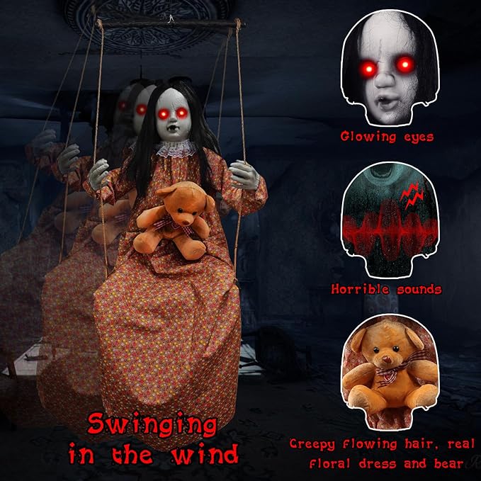 Scary Halloween Decorations Outdoor, Halloween Hanging Swinging Doll Girl with Sound & Slap Activated, Light Up Eyes Creepy Sound Expressions, Large Scary Halloween Decor Props for Indoor Outside