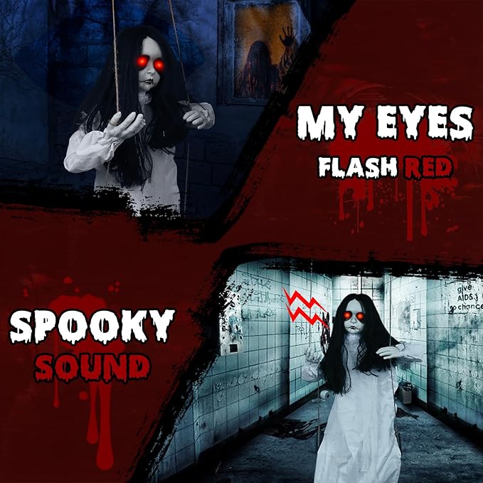 - VOICE AND SLAP ACTIVATION: Clapping or making a sound, or slapping it hard all can activates scary sounds and glowing LED eyes. Surprise your guests and trick-or-treaters. Imagine that you call out to a girl in white who is swinging at night. She suddenly makes a creepy sound and screams, her eyes flashing evil red, highlighting the creepy skull eyes, sewn corners of her mouth and skeleton hands holding the swinging rope. Your Halloween holiday will be scary and exciting