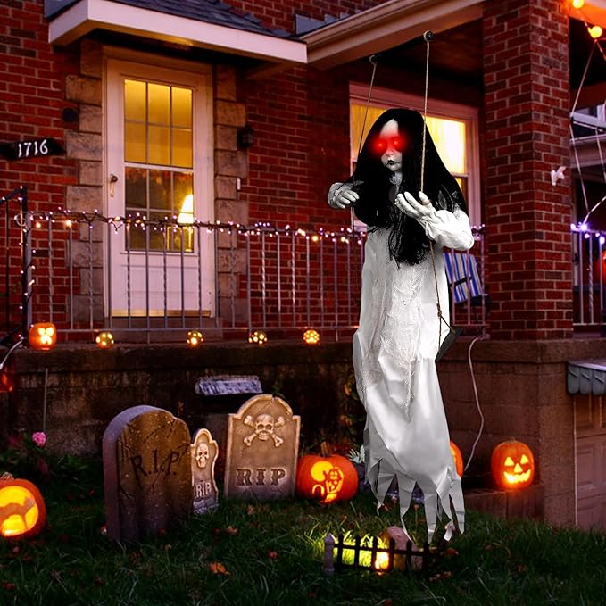 - SCARY HALLOWEEN DECORATIONS OUTDOOR: This Halloween swinging girl is perfect scary Halloween decorations indoor and outdoor, you can hang it on the tree, gate entrance, patio railing or wall. Get Halloween props for your yard, cemetery scene, or Halloween party! This outdoor decoration is perfect for everyday patio gatherings and fits the Halloween theme