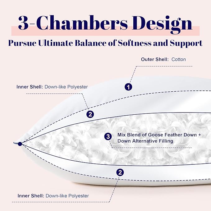 - Unique Three Chamber Construction: Bedding pillow designed with a fabrication process that includes a double-layer fabric method and the filling wrapped in a organic cotton to help wick away moisture for a cooler, provide the perfect balance between softness and support, ensuring you wake up refreshed and rejuvenated.