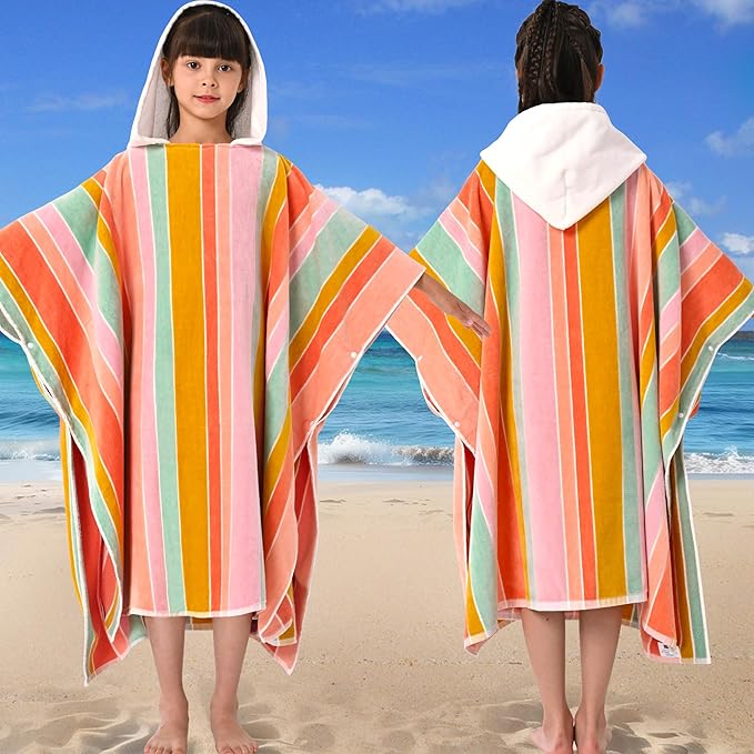 VOOVA & MOVAS Big Kids Hooded Poncho Towels for Teens (8-16Years), 100% Cotton Thick Poncho Towel, Perfect for Pool, Beach, Bath,Pink Blue Purple Stripe