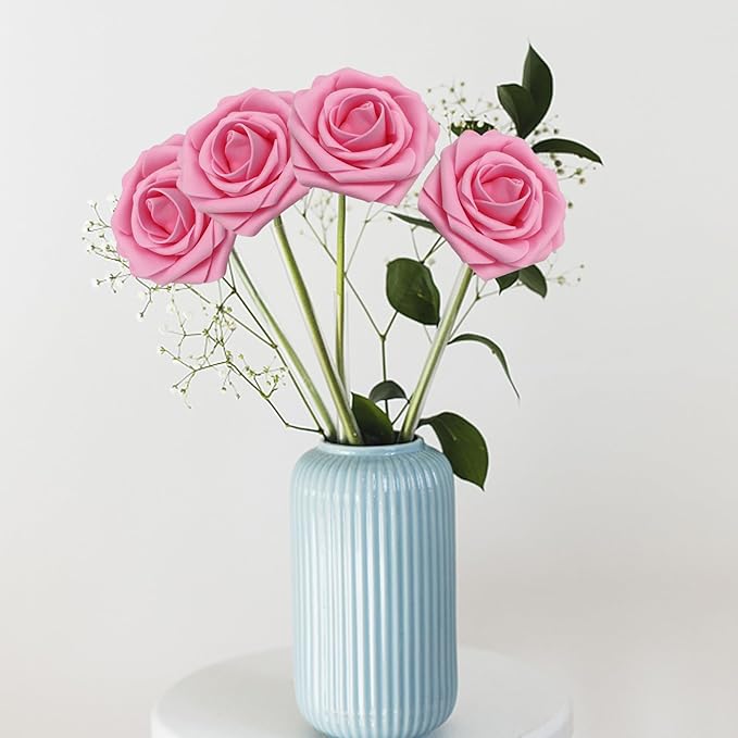 Artificial Flowers Dark Pink Roses 100PCS Real Looking Foam Fake Roses with Leaves and for DIY Wedding Bouquets Bridal Shower Centerpieces Party Decorations (Dark Pink, 100)