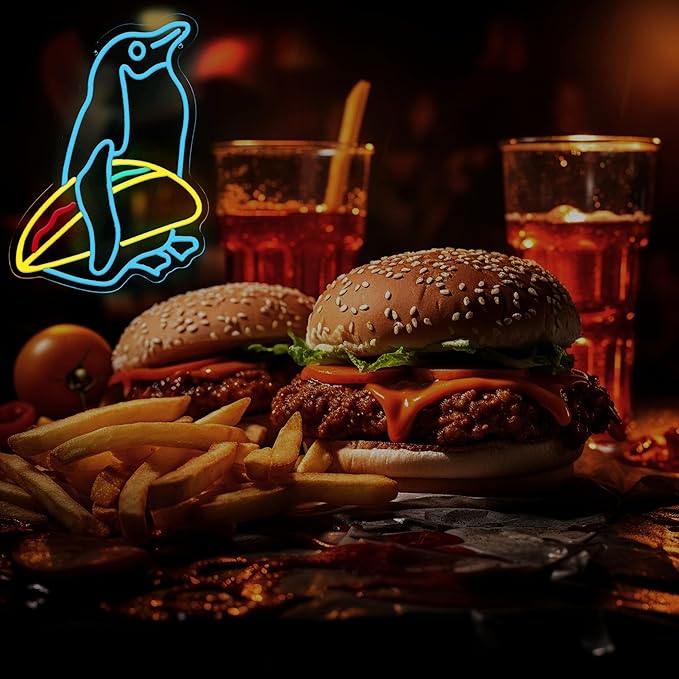 Penguin Tacos Neon Sign Cute Penguin LED Light Up Sign for Nursery Room Wall Decor Man Cave Game Room Penguin Gifts11.9"×15.7"