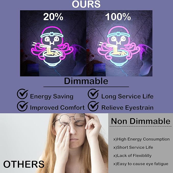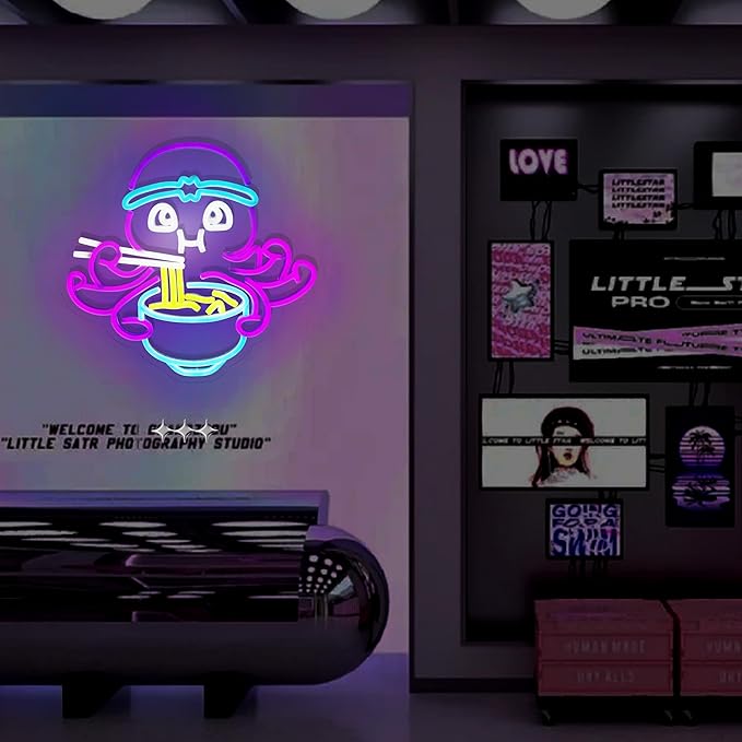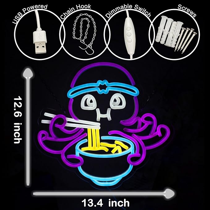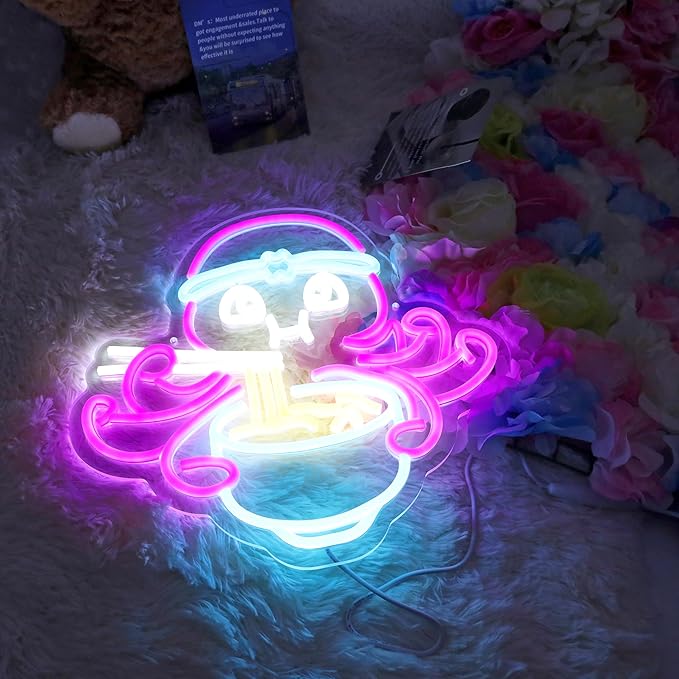 Octopus Eat Ramen Neon Sign for Room Wall Decor Japanese LED Neon Light Restaurant Cafe Decor Man Cave Game Room Wall Art 13.4"×12.6"