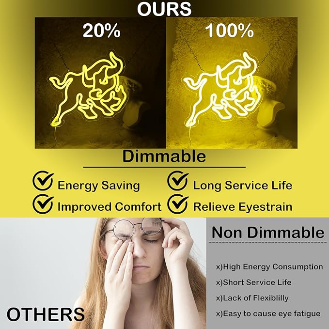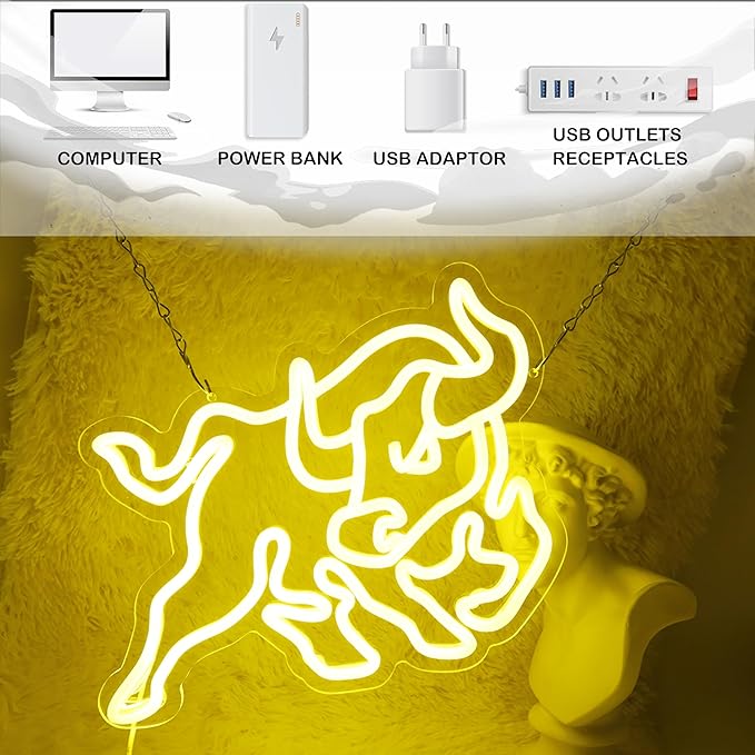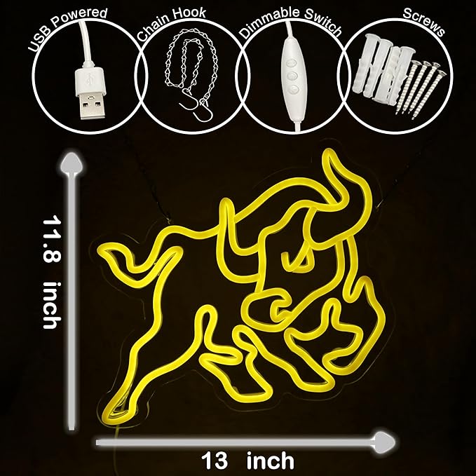 Bull Wall Street Neon Sign Dollar Neon Light Bull LED Neon Sign for Room Wall Décor Dimmable LED Neon Light for Bar Restaurant Music Concert Man Cave Game Room Wall Art 13"×11.8"