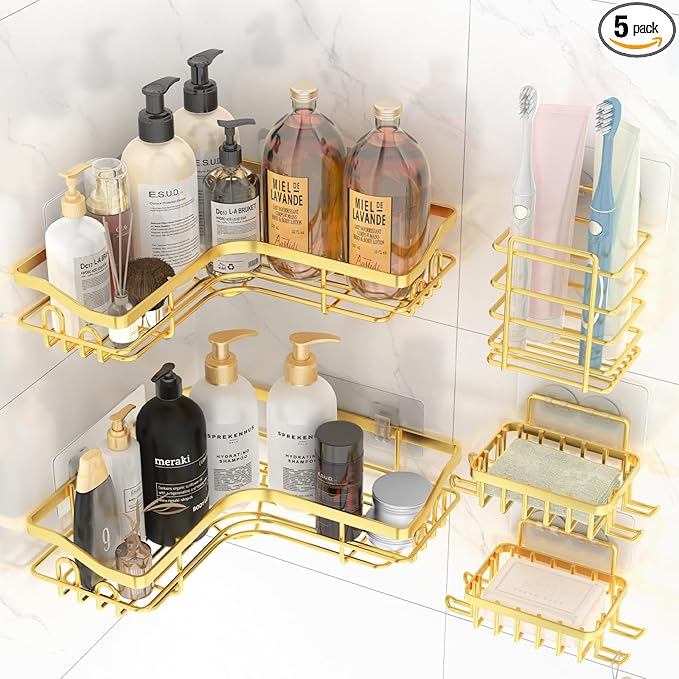 Gold Corner Adhesive Shower Caddy,Rustproof Stainless Steel Corner Shower Shelves for Bathroom Kitchen, No Drilling Wall Mounted Shower Rack for Inside Shower, 5 Pack