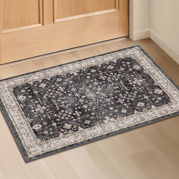 Black Washable Entry Rug, 2x3 Small Rugs for Entryway Kitchen Bathroom Door Mat Indoor Entrance, Non Slip Rubber Backing, Stain & Fade Resistant, Ashen Charcoal Floral Decor