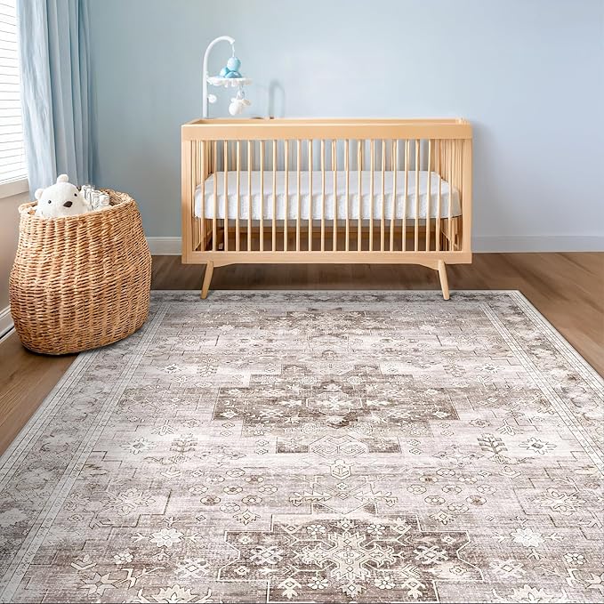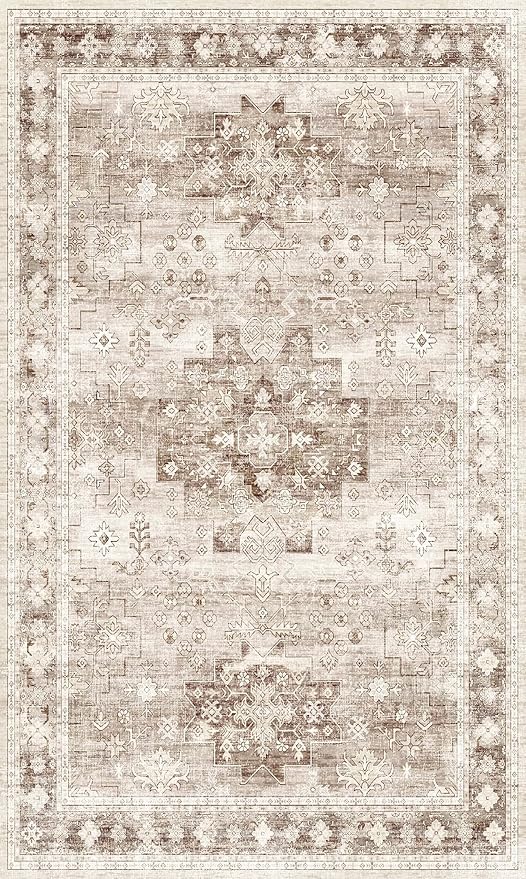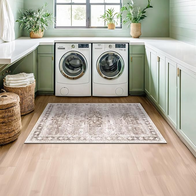Washable Neutral Farmhouse Large Entryway Rug, 3x5 Area Rugs for Kitchen, Bedroom, Laundry Room, Nursery Room, Boho Vintage Floral Non-Slip Throw Rug Low Pile Stain Resistant (3x5 Beige/Latte)