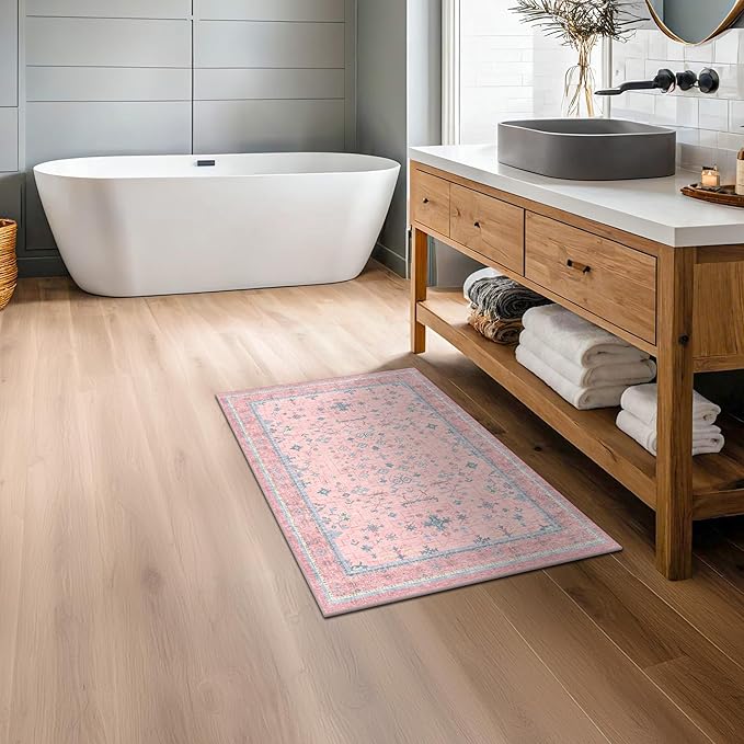 Pink Boho Bathroom Rug, 2x3 Small Throw Rugs for Entryway Kitchen Girls Bedroom Kids Room, Modern Oushak Floral Design, Machine Washable Non Slip Low Pile Stain Resistant Soft Faux Wool Carpet