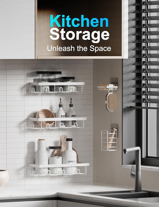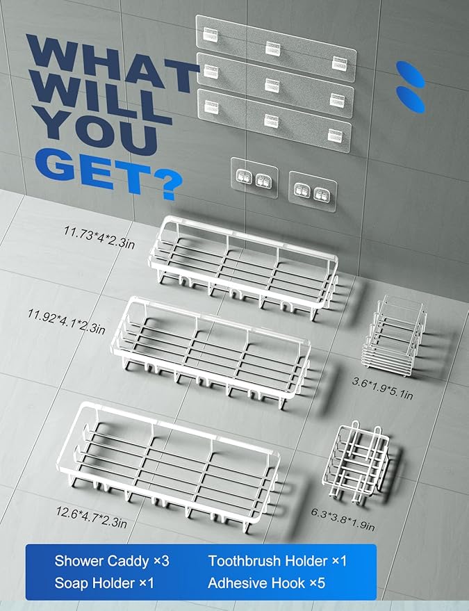 - 5 Must-Have Bathroom Organizers and Storage: Our shower organizer set includes 3 shower caddies, 1 soap rack, 1 toothbrush shelf, and 5 adhesive hooks, providing more storage space than ever before. The shower shelves set is designed with over 11 sturdy metal hooks for bath towels or sponges. It's not only perfect for organizing bath supplies but also for storing other essentials. These compact and versatile shelves can meet all your storage needs, fitting well in the bathroom, washroom, kitchen, RV, bedroom, living room, laundry room, and tool room.