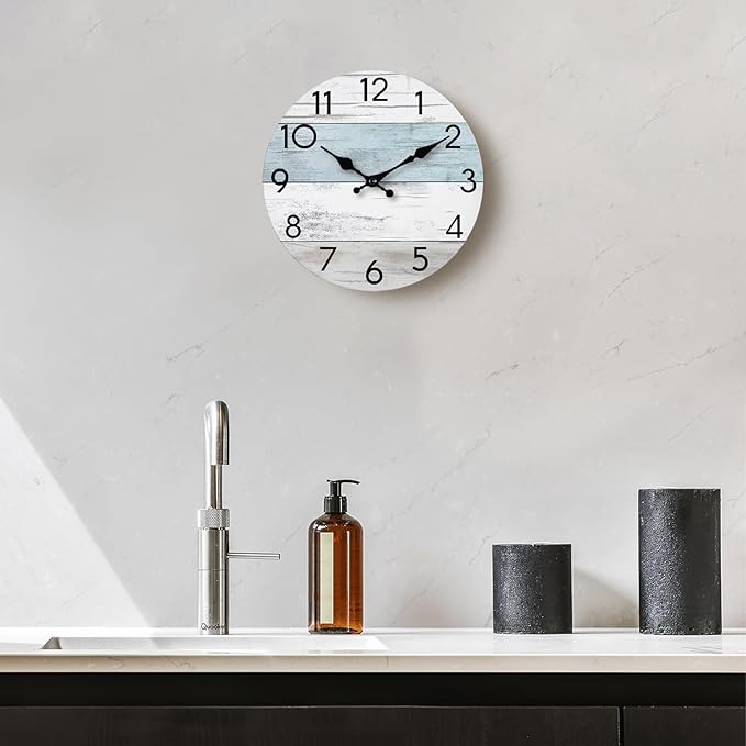 Wall Clock Silent Non-Ticking Wooden Clocks Battery Operated 8 Inch Small Country Retro Rustic and Beach Style Decorative for Kitchen, Home, Bathroom, Bedroom (Blue)