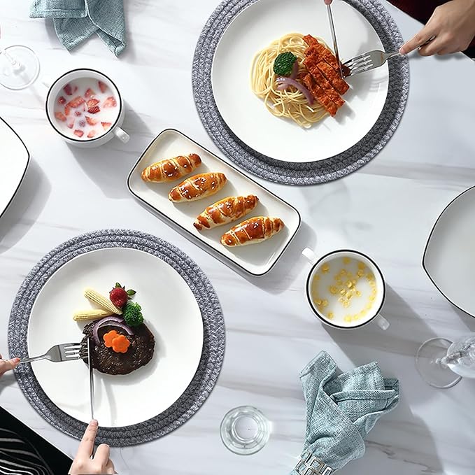 - Material: Our placemats are made of woven cotton rope, not easy to deform, double sided available. The placemats are wipeable, washable, heat resistant and non slip.