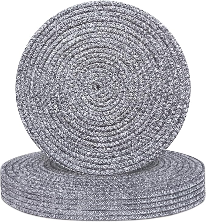 Round Placemats Set of 6, Cotton Rope Woven Table Mats, Hot Pads for Kitchen, Non Slip Heat Resistant Place Mats, 13 Inches Braided Placemat for Farmhouse Decor and Kitchen Table Decor (Gray)