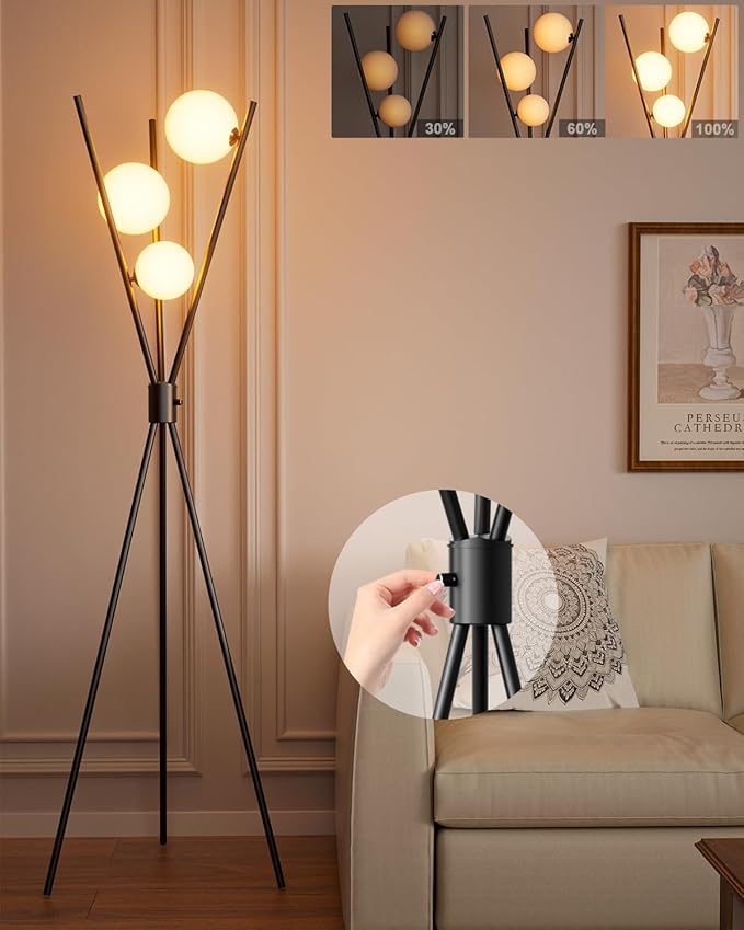 3 Globe Dimmable Tripod Floor Lamp, Mid Century Standing Lamps with 3Pcs 3000K Bulbs Included, Modern Tall Lamp for Living Room Bedroom Office-Black