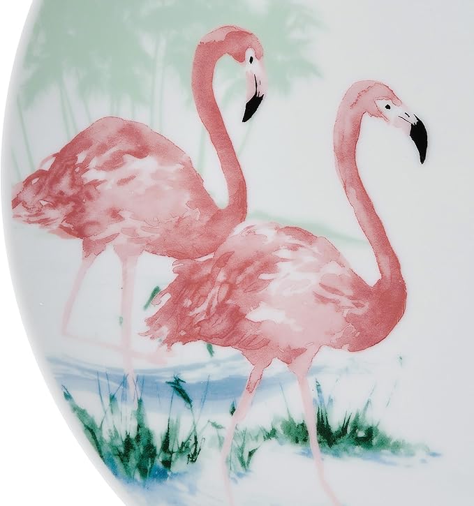 - PLAYFUL PRESENTATION: this bright white dinnerware is accented with a charming depiction of two flamingos on coupe-shaped pieces