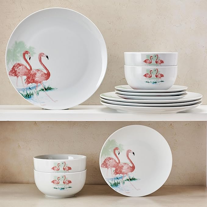 Studio Nova Flamingo Haven Tropical 12 Piece Dinnerware Plate Bowl Set, Service for 4