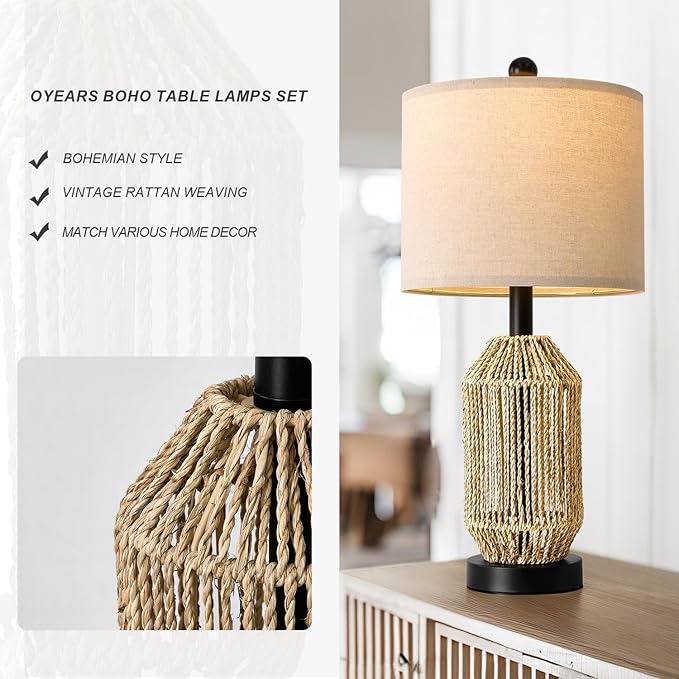 OYEARS 21" Boho Table Lamps Set of 2 for Living Room, Bedside Lamps for Nightstand, Rattan Lamp for Bedroom, Farmhouse Table Lamps for Boho Decor, End Table, Retro, Black
