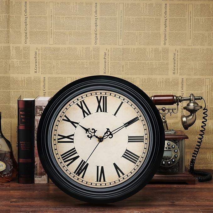 Plumeet Retro Wall Clock, 12'' Non Ticking Classic Silent Vintage Wall Clocks Decorative Kitchen Living Room Bedroom, Roman Numerals, Battery Operated, Black