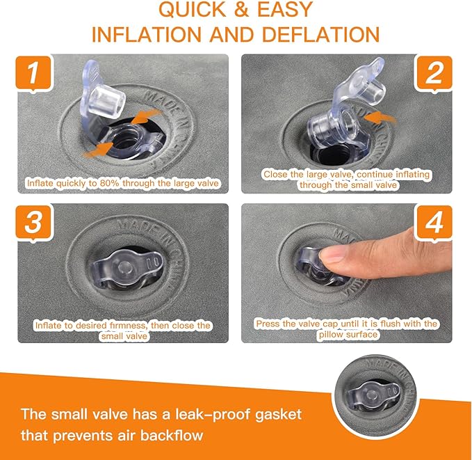 - Double Cap Valve - The inflatable foot rest pillow features a 2-in-1 double valve. The upper small valve is a one-way air inlet for inflating air, while the bottom big valve allows quick inflation and deflation. This airplane travel essential is perfect for use as a travel pillow, airplane footrest, or car pillow for kids and adults. This upgraded design is ideal for baby and toddler travel accessories.